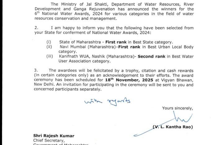 याबाबत केंद्रीय जलशक्ती मंत्रालयाचे सचिव व्ही.एल. कान्ता राव यांनी राज्याचे मुख्य सचिव राजेशकुमार यांना पत्राद्वारे कळविले आहे. हा पुरस्कार वितरण समारंभ १८ नोव्हेंबर २०२५ रोजी नवी दिल्ली येथील विज्ञान भवनात पार पडणार असून, राज्याला ट्रॉफी, प्रशस्तिपत्र आणि रोख पारितोषिक देऊन गौरविण्यात येणार आहे.